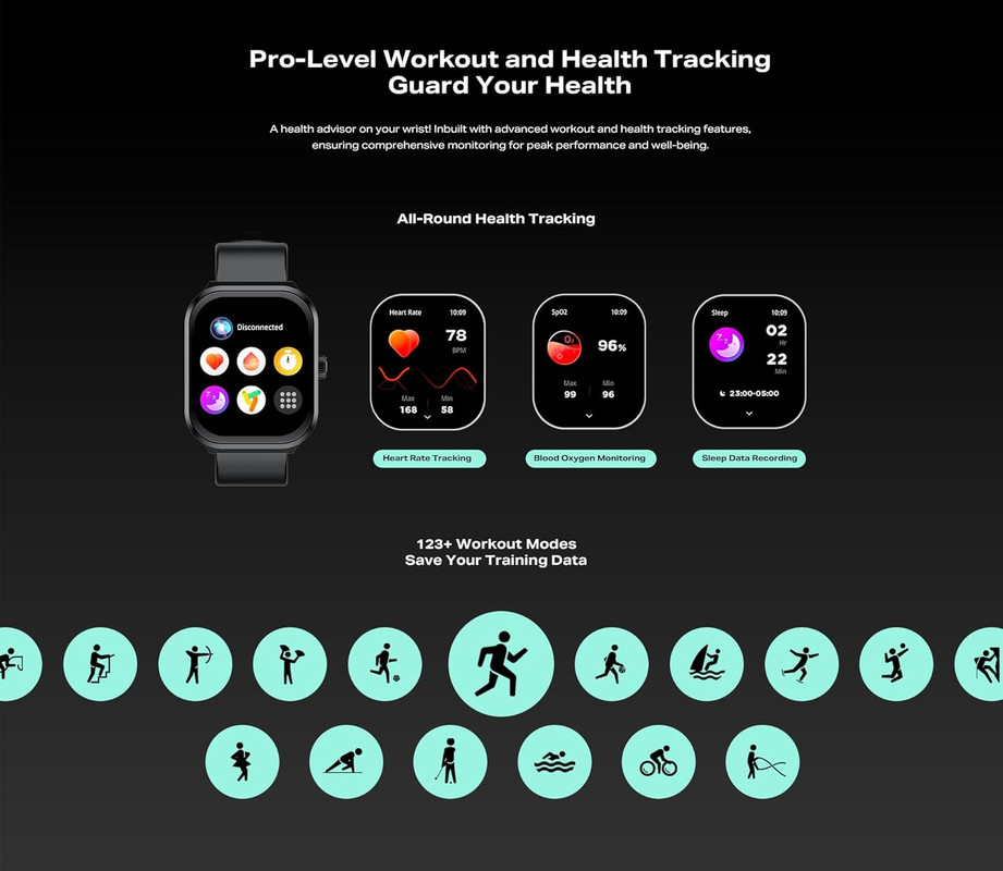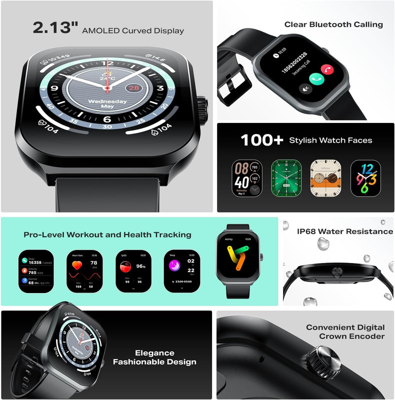 التصميم والشاشة: شاشة AMOLED منحنية مقاس 2.13 بوصة بدقة عالية وتصميم دائري أنيق. أكثر من 200 وجه ساعة قابل للتخصيص. هيكل مقاوم للماء بمستوى IP68 (مناسبة للسباحة والغوص حتى 50 متر). الصحة واللياقة: تتبع صحي متقدم: مراقبة معدل ضربات القلب، النوم، الخطوات، والسعرات الحرارية. أوضاع رياضية متعددة لدعم مختلف التمارين والأنشطة. الميزات الذكية: دعم المكالمات عبر البلوتوث للرد على المكالمات مباشرة من الساعة. إشعارات للرسائل والتطبيقات. لا تحتوي على GPS مدمج (تعتمد على هاتفك للتتبع). البطارية: بطارية تدوم حتى 7 أيام في الاستخدام العادي. التوافق: متوافقة مع أندرويد (مذكور في المواصفات). اتصال بلوتوث للمزامنة مع الهاتف. الضمان: ضمان لمدة سنة واحدة. اللون: أسود.