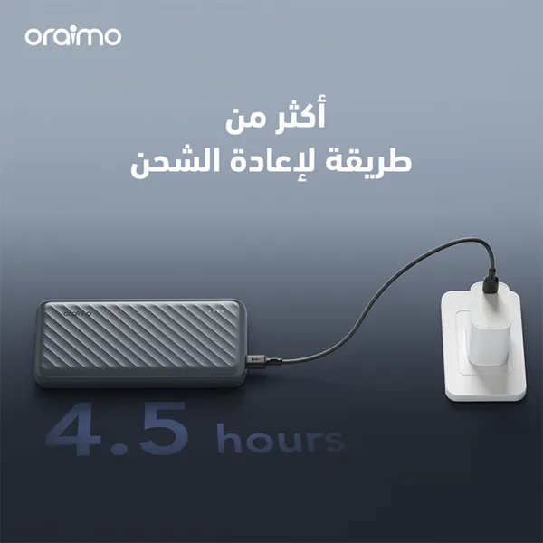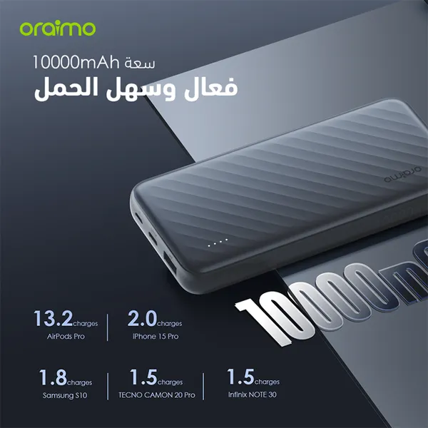 السعة: 10000 مللي أمبير (37 واط ساعي) المدخلات: Micro-USB: 5V/2A, 9V/2A, 12V/1.5A Type-C: 5V/3A, 9V/2A, 12V/1.5A (شحن سريع) المخرجات: كابل Lightning مدمج: PD 20W (5V/2.4A, 9V/2.22A, 12V/1.6A) كابل Type-C مدمج: QC 18W + FCP 22.5W (5V/3A, 9V/2A, 12V/1.5A) كابل Micro-USB مدمج: 15W (5V/2.1A) منفذ USB-A إضافي: 5V/3A الشحن المتزامن: يدعم شحن 4 أجهزة في وقت واحد (عبر الكابلات المدمجة + منفذ USB-A) وقت الشحن الكامل: 4.5 ساعات (باستخدام مدخل Type-C سريع) الموديل: OPB-P7101 الميزات الرئيسية: 3 كابلات مدمجة لتغطية شاملة: Lightning (لأجهزة iPhone) بشحن سريع PD 20W. Type-C (لأجهزة Android) بشحن سريع QC 18W + FCP 22.5W. Micro-USB (لأجهزة older Android) بشحن 15W. شحن 4 أجهزة مرة واحدة: استخدام الكابلات المدمجة + منفذ USB-A لشحن متعدد بدون الحاجة لكابلات خارجية. تصميم متين وذكي: كابلات مدمجة بمادة مقواة ومقاومة للتشابك. شريحة ذكية تتكيف مع بروتوكول الشحن السريع لكل جهاز. إعادة شحن سريعة: شحن البنك نفسه بالكامل في 4.5 ساعات عبر مدخل Type-C. أمان متقدم: بطارية ليثيوم بوليمر مع حماية من: الشحن الزائد / السخونة الزائدة / الدوائر القصيرة. توافق عالمي: متوافق مع أكثر من 1000 جهاز (iPhone, Samsung, Huawei, إلخ). محتويات العلبة: بنك الطاقة oraimo Slice Link Pro دليل المستخدم لا حاجة لكابلات إضافية (جميع الكابلات مدمجة).