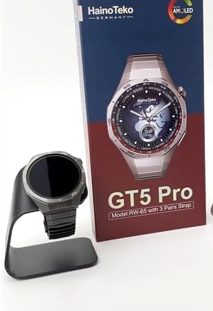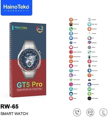 مواصفات Smart Watch Haino Teko GT5 Pro شاشة AMOLED بمقاس 1.43 انش. السعة: 350 مللي أمبير. سعة تخزين الذاكرة 50 ميجا بايت. مقاومة للماء بمعيار IP68. كاميرا مدمجة لالتقاط الصور. تتوافق مع نظام الأندرويد وIOS. 3 أحزمة من السيليكون، الجلد، المعدن. يتوافر المعدن باللون الفضي والأسود. مميزات ساعة Smart Watch Haino Teko GT5 Pro تتميز بشاشة AMOLED كبيرة توفر ألوان زاهية ووضوح عالي لتجربة مثالية. تأتي الساعة مع ثلاثة أحزمة عالية الجودة قابلة للتبديل لتتمكن من استخدامها في مناسباتك المختلفة. توفر الساعة خاصية البحث عن الساعة والموبايل، وتتميز بتطبيقات متعددة ومساعد صوتي. تتمتع بتصنيف IP68 لمقاومة الماء، مما يجعلها مناسبة للاستخدام اليومي. استخدام ساعة Haino Teko GT5 Pro التقاط الصور. لعب الألعاب. استقبال المكالمات والرسائل. تتبع اللياقة البدنية. التعرف على الطقس. التحكم في المقاطع الصوتية.